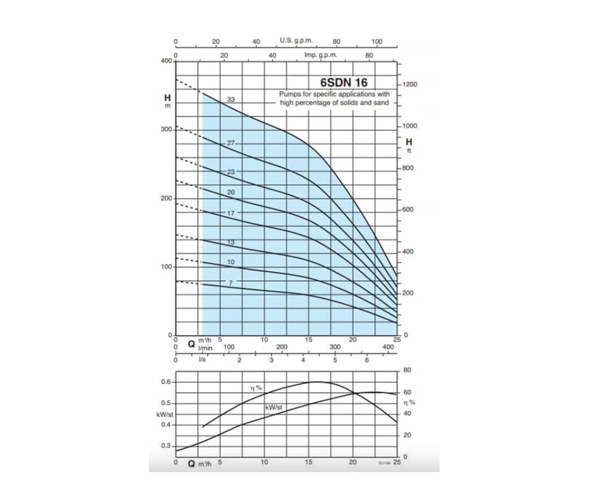 ტუმბოს გარე გარსი დამზადებულია AISI 304 უჟანგავი ფოლადისგან, ხოლო ტუმბოს ჰიდრავლიკური ნაწილები (6SDN) ოპტიმიზებულია მაღალი ეფექტურობისთვის.